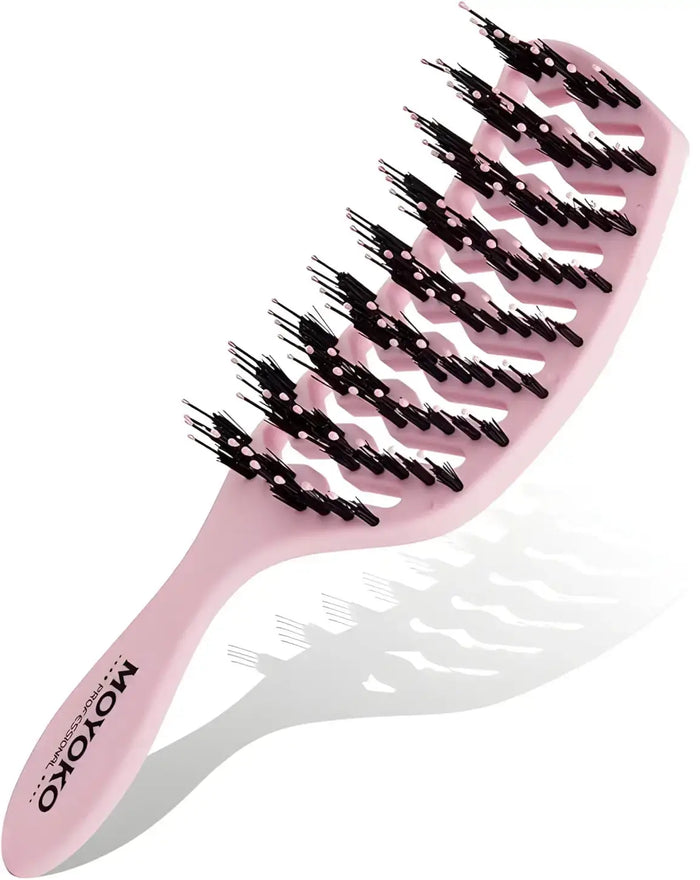 The Moyoko Detangling Brush in Pastel Pink features flexible bristles that gently work through knots and tangles without pulling or breaking hair. The ergonomic design provides comfortable control for pain-free detangling on all hair types.
