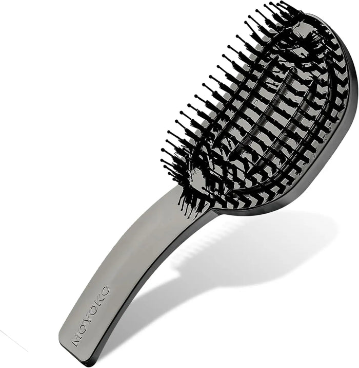 The Moyoko Hailo Detangling Brush in Gun Chrome features a sleek design with argan oil-infused bristles that detangle effortlessly while boosting shine. Designed for both wet and dry use, it leaves every strand smooth and manageable.