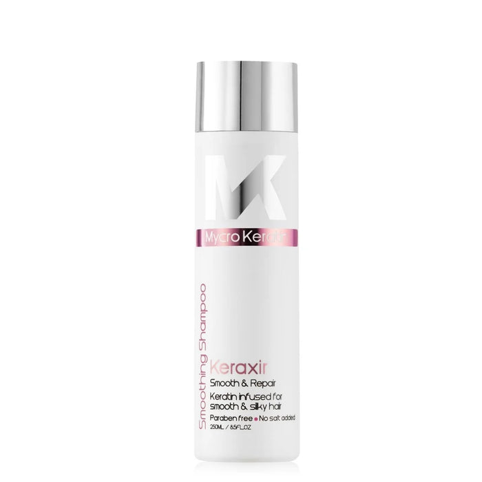 Mycro Keratin Keraxir Smoothing Shampoo 250ml is a frizz-control shampoo designed for all hair types. Harnessing Nano Keratin technology, it smooths, nourishes, and protects hair during cleansing for salon-quality results at home. Ideal for taming frizz and unruly strands with a lightweight, effective formula. This shampoo is also a great choice for anyone looking for a Nano Keratin shampoo that enhances shine and manageability.