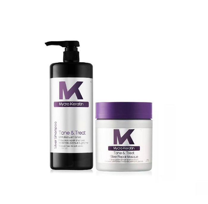 Designed for blonde and grey hair, including natural silver tones and color-treated blondes who want to counter brassiness. Suitable for all hair types seeking stronger, more hydrated strands with enhanced tone. Tip: use smaller amounts for fine hair to avoid weighing down, and extend masque time for thicker or coarser hair for deeper conditioning. This Mycro Keratin Tone & Treat Bundle is perfect for anyone looking to enhance their hair's vibrancy and health.