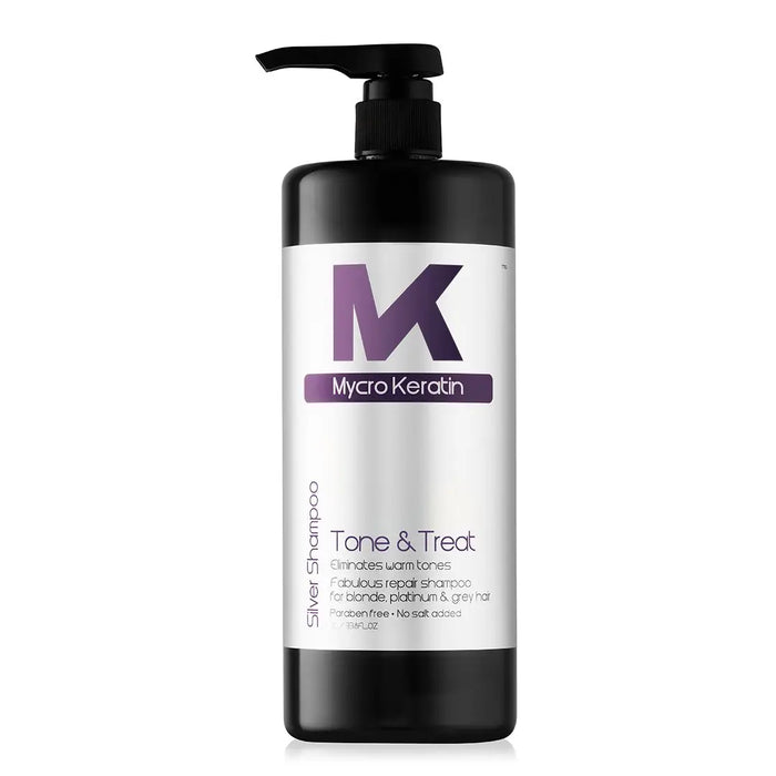 Mycro Keratin Tone&Treat Silver Shampoo 1L is a targeted toning shampoo for blonde, silver, and highlighted hair. It blends violet micro-pigments with a keratin infusion to neutralize brassiness while strengthening and smoothing the hair, delivering cooler tones and a vibrant, healthy finish. This Mycro Keratin Silver Shampoo is essential for maintaining the beauty of color-treated hair.