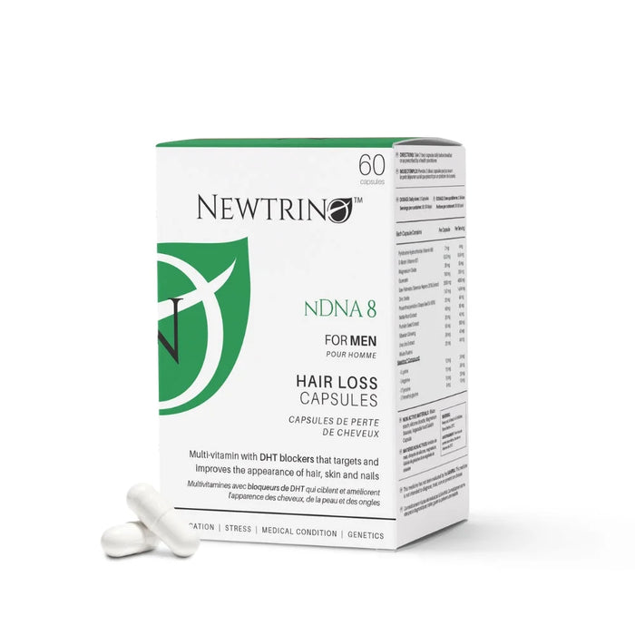 Newtrino nDNA 8 Capsules for Men is a vitamins & supplements hair treatment designed to support thinning hair from within. Targeting all hair types, it uses advanced DHT and PGD2 blockers to help reduce hair loss and revitalize hair from the inside out. Ideal for men seeking a proactive, internal solution to thinning hair and vitality. The Newtrino nDNA 8 Capsules for Men are formulated to be effective for various hair types, ensuring that every man can benefit from this hair health supplement.