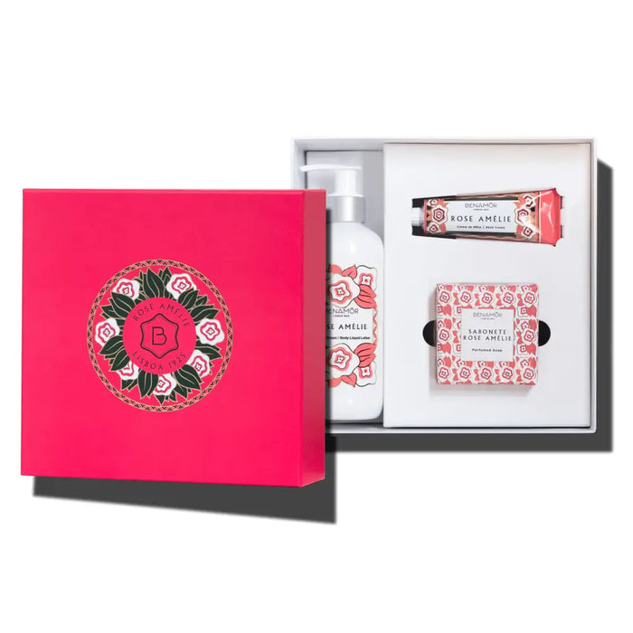 Elevate your self-care routine with this exquisite set containing the Rose Amélie Soap, Body Lotion, and Hand Cream. Cleanse, moisturize, and protect, enjoying a comprehensive skincare experience all in one collection.